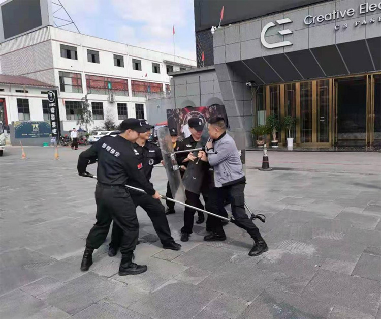 由保安隊長詳細(xì)講解防暴器械使用要領(lǐng),認(rèn)真進(jìn)行動作示范,隊員逐一對照練習(xí)。主要包括鋼叉、盾牌、甩棍等的單獨使用,以及配合使用方法。通過有效利用防暴器械,達(dá)到抵御打擊匪徒、保護(hù)自身安全和維護(hù)客戶正常環(huán)境的目的。